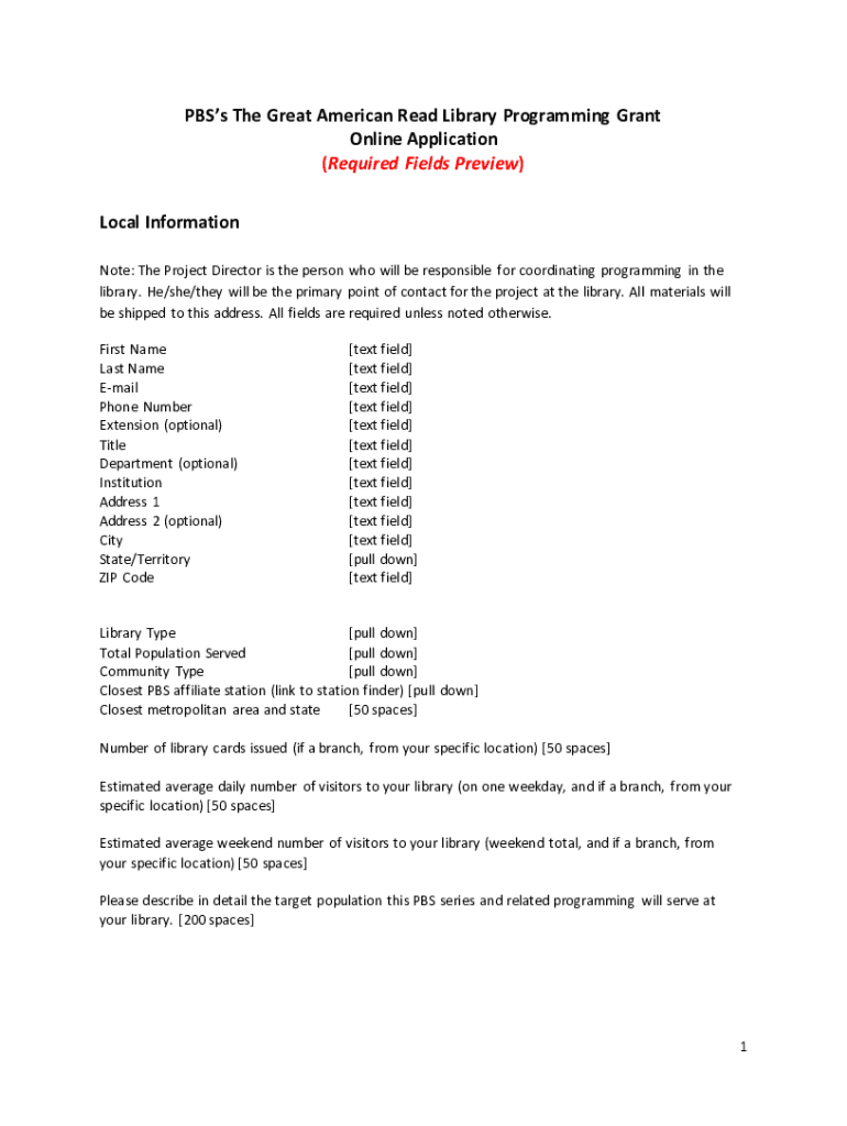 PBS's The Great American Read Library Programming Grant Online Application (Required Fields Preview) Local Information Note: The Project Director is the person who will be responsible for coordinating