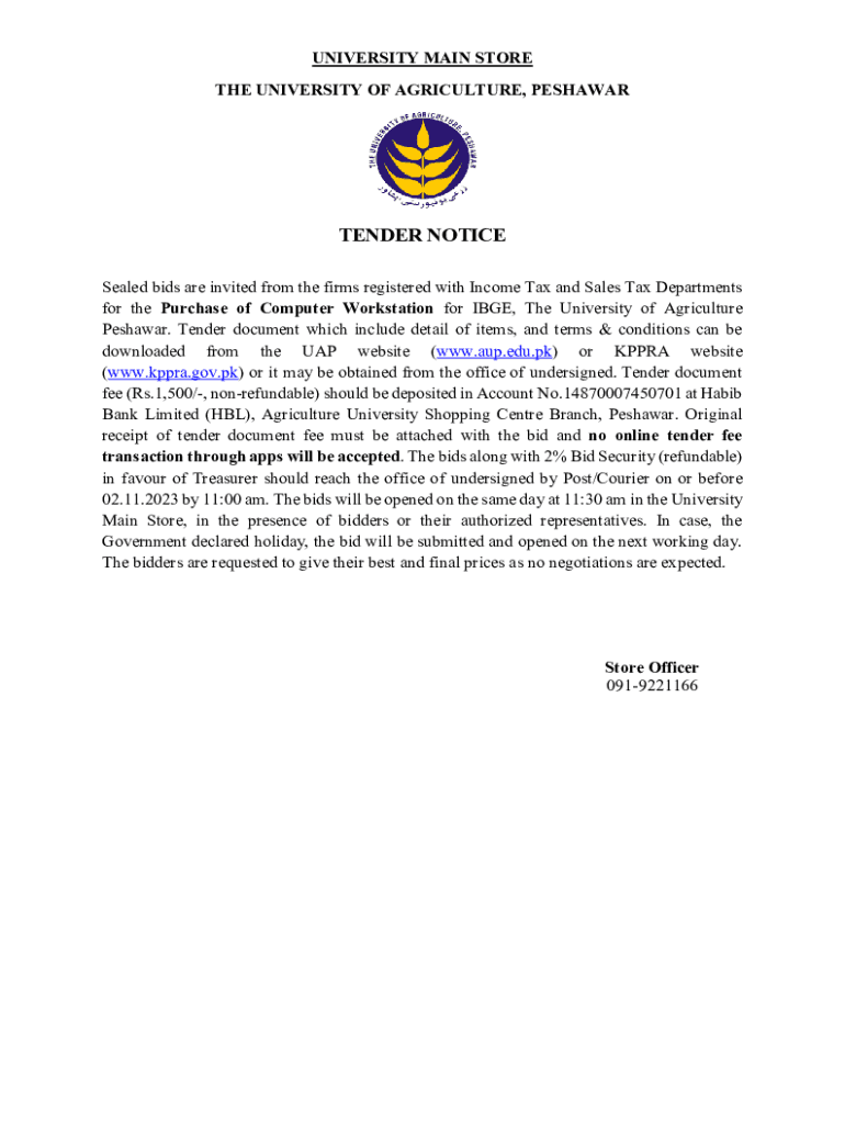 THE UNIVERSITY OF AGRICULTURE, PESHAWARTENDER NOTICE