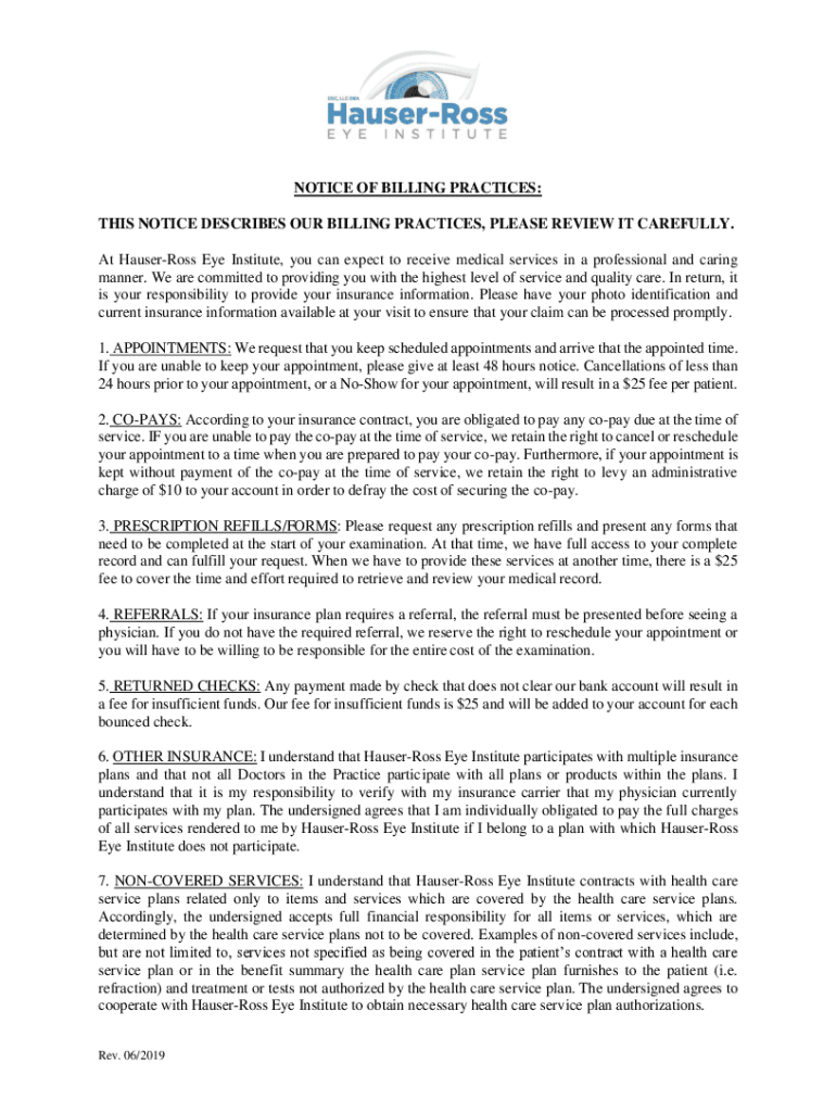 NOTICE OF BILLING PRACTICES: THIS NOTICE DESCRIBES OUR BILLING PRACTICES, PLEASE REVIEW IT CAREFULLY. At HauserRoss Eye Institute, you can expect to receive medical services in a professional and