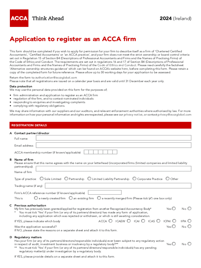 2024 (Ireland)Application to register as an ACCA firm This form should be completed if you wish to apply for permission for your firm to describe itself as a firm of Chartered Certified Accountants,
