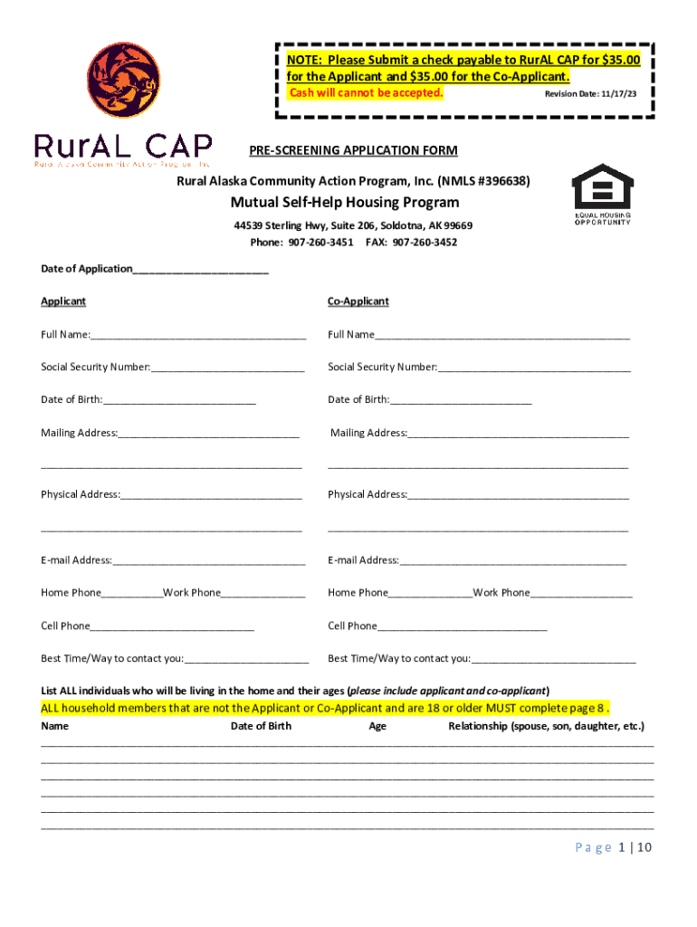 NOTE: Please Submit a check payable to RurAL CAP for $35.00 for the Applicant and $35.00 for the CoApplicant. Cash will cannot be accepted.Revision Date: 11/17/23PRESCREENING APPLICATION FORM Rural