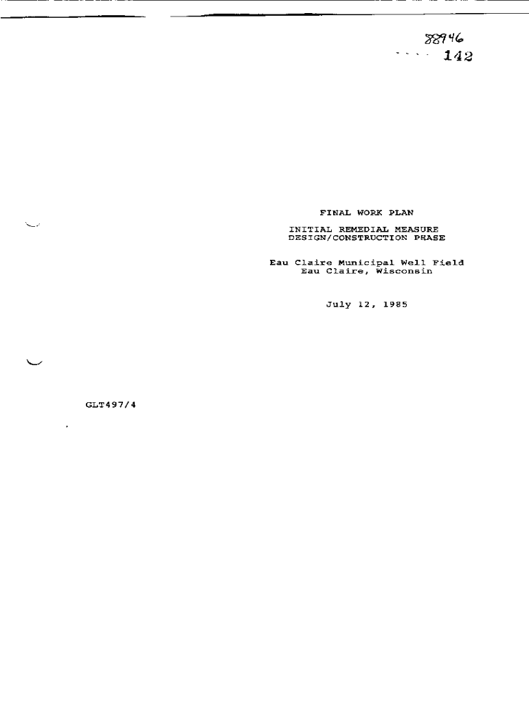 387 & 142FINAL WORK PLAN INITIAL REMEDIAL MEASURE DESIGN/CONSTRUCTION Phase Claire Municipal Well Field Eau Claire, Wisconsin July 12, 1985GLT497/4INTRODUCTION This work plan outlines the engineering