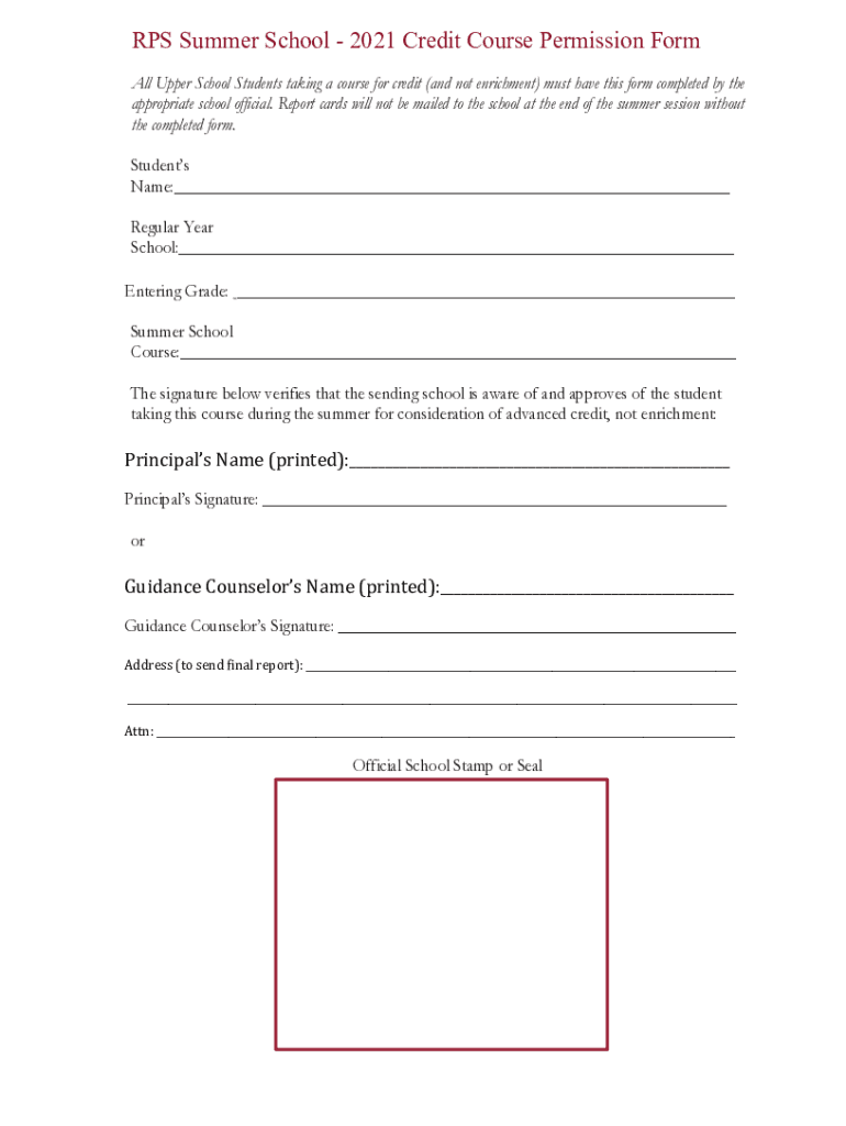 RPS Summer School 2021 Credit Course Permission Form All Upper School Students taking a course for credit (and not enrichment) must have this form completed by the appropriate school official. Report