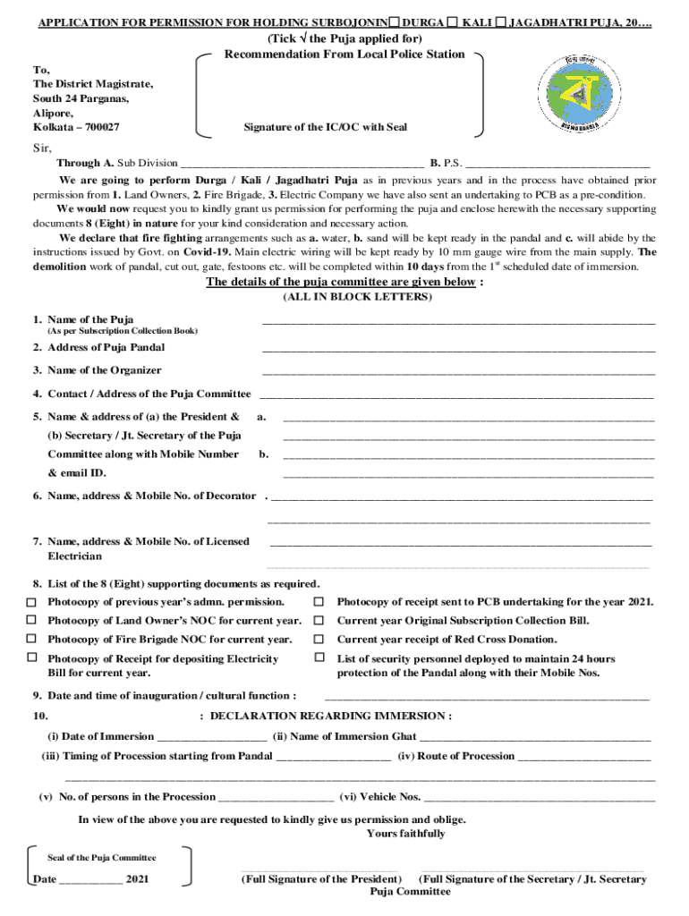 APPLICATION FOR PERMISSION FOR HOLDING SURBOJONINDURGAKALIJAGADHATRI PUPA, 20.(Tick the Pupa applied for)