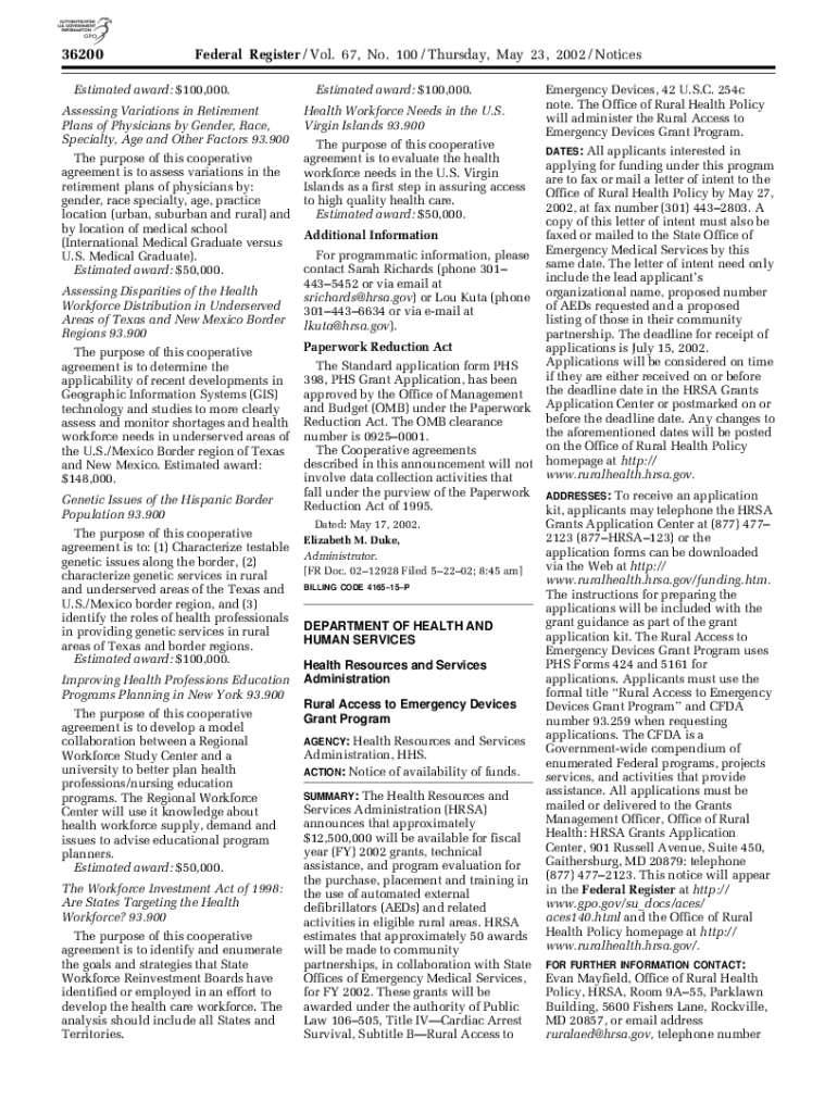 36200Federal Register / Vol. 67, No. 100 / Thursday, May 23, 2002 / Notices Estimated award: $100,000.Estimated award: $100,000. Assessing Variations in Retirement Plans of Physicians by Gender, Race,