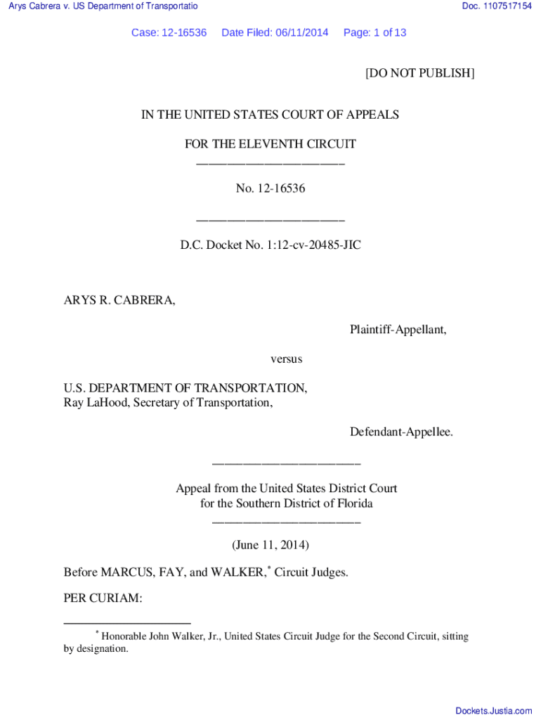 Arys Cabrera v. US Department of TransportatioCase: 1216536Doc. 1107517154Date Filed: 06/11/2014Page: 1 of 13[DO NOT PUBLISH] IN THE UNITED STATES COURT OF APPEALS FOR THE ELEVENTH CIRCUIT ___ No.