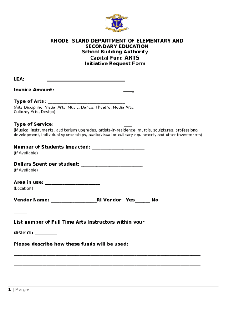 The School Building Authority Capital Fund ARTS Initiative Request - ride ri is a writable document that has to be filled-out and signed for certain purpose. Then, it is furnished to the actual addressee to provide some details of certain kinds. The completion and signing is able or using a trusted tool e. g. PDFfiller. Such applications help to submit any PDF or Word file without printing out. It also lets you customize its appearance depending on your requirements and put an official legal electronic signature. Once done, the user ought to send the School Building Authority Capital Fund ARTS Initiative Request - ride ri to the recipient or several of them by email and also fax. PDFfiller has a feature and options that make your document of MS Word extension printable. It includes a variety of settings when printing out appearance. It doesn't matter how you will file a document - in hard copy or electronically - it will always look professional and clear. To not to create a new editable template from scratch again and again, turn the original Word file as a template. Later, you will have a rewritable sample.