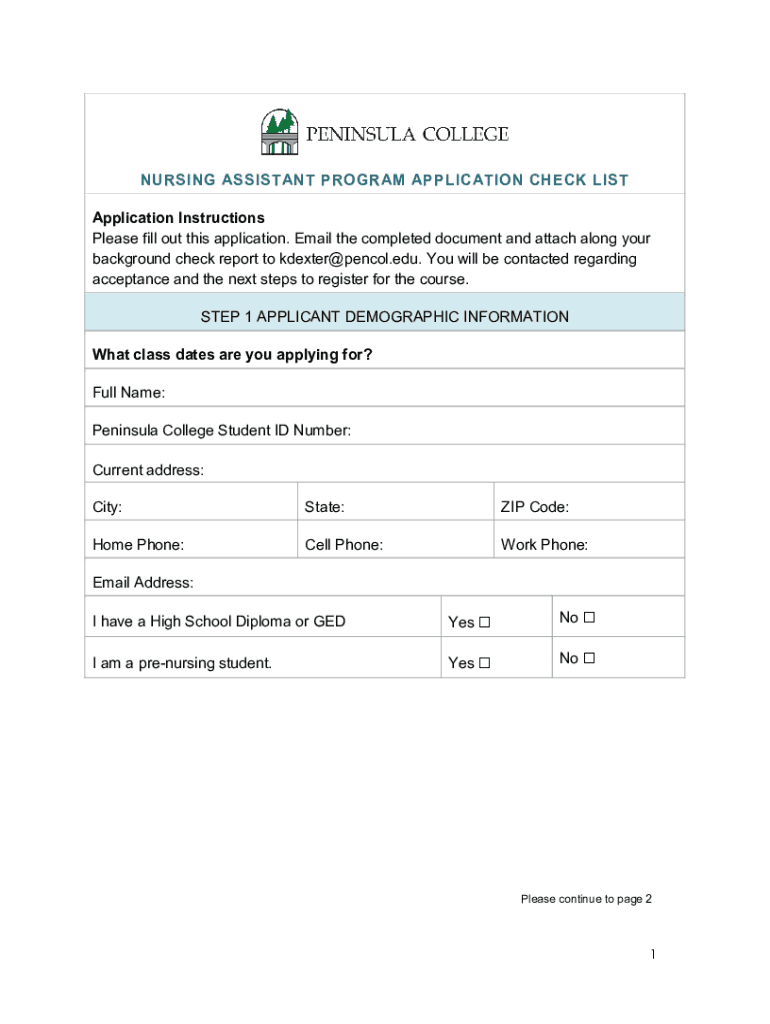 NURSING ASSISTANT PROGRAM APPLICATION CHECK LIST Application Instructions Please fill out this application. Email the completed document and attach along your background check report to kdexter@pencol.edu.