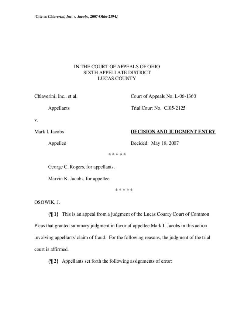 [Cite as Chiaverini, Inc. v. Jacobs, 2007Ohio2394.]IN THE COURT OF APPEALS OF OHIO SIXTH APPELLATE DISTRICT LUCAS COUNTYChiaverini, Inc., et al.Court of Appeals No. L061360AppellantsTrial Court No.