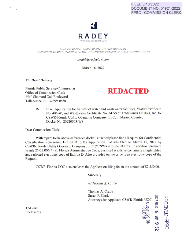 FILED 3/16/2022 DOCUMENT NO. 01921 2022 FPSC COMMISSION CLERK_:t RADEY ATTORt,,i(YS & COUNSCLORS ot LAWf \'t (850) 4256654 n 1850) 4256694 , :s WWW.RADEYLAW.COM M \'IL POST OFFICE BOX 10967 I TALLAHASSEE.
