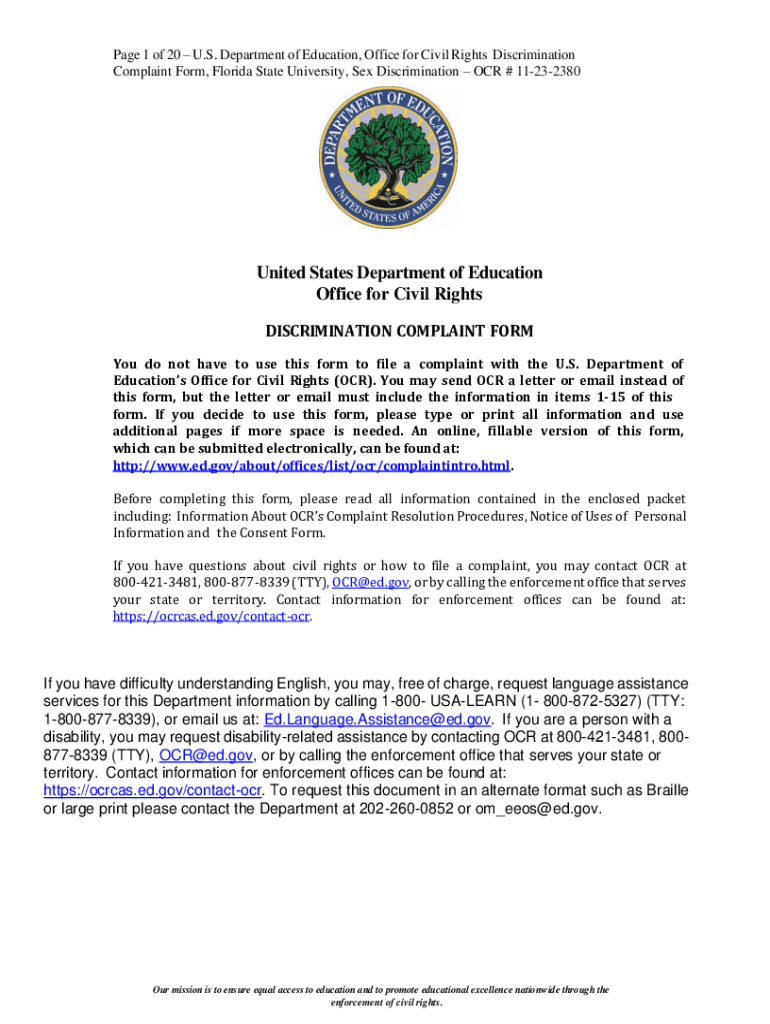 Page 1 of 20 U.S. Department of Education, Office for Civil Rights Discrimination Complaint Form, Florida State University, Sex Discrimination OCR # 11232380United States Department of Education Office