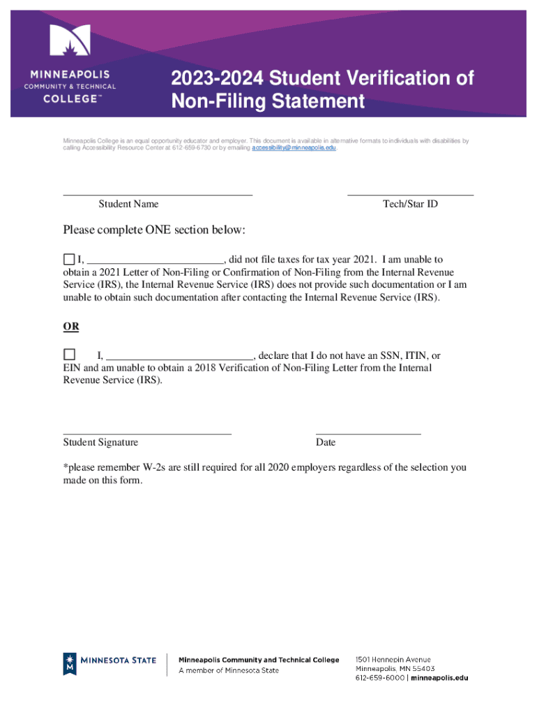 20232024 Student Verification of NonFiling Statement Minneapolis College is an equal opportunity educator and employer. This document is available in alternative formats to individuals with disabilities