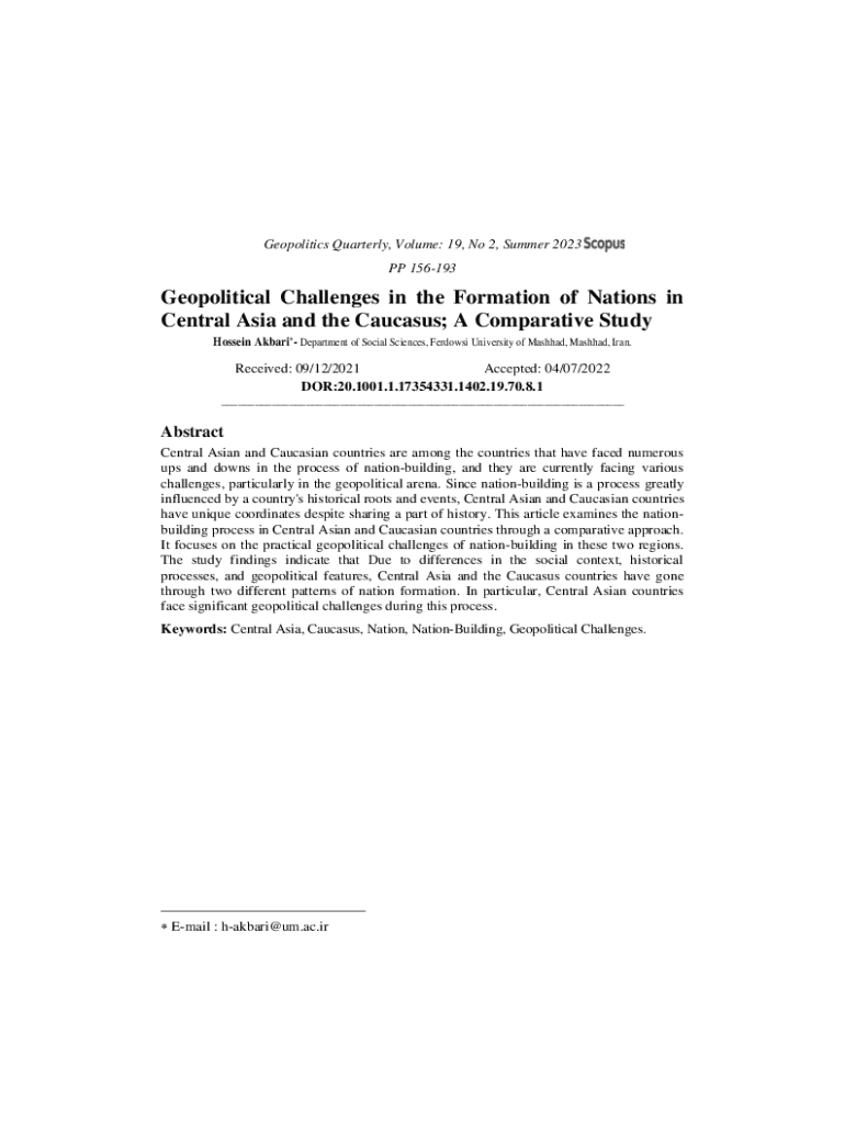 Geopolitics Quarterly, Volume: 19, No 2, Summer 2023 PP 156193Geopolitical Challenges in the Formation of Nations in Central Asia and the Caucasus; A Comparative Study Hossein Akbari Department of