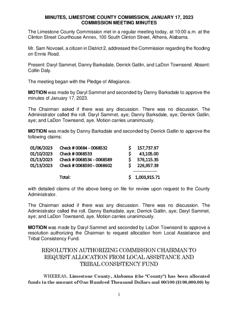MINUTES, LIMESTONE COUNTY COMMISSION, JANUARY 17, 2023 COMMISSION MEETING MINUTES The Limestone County Commission met in a regular meeting today, at 10:00 a.m. at the Clinton Street Courthouse Annex,