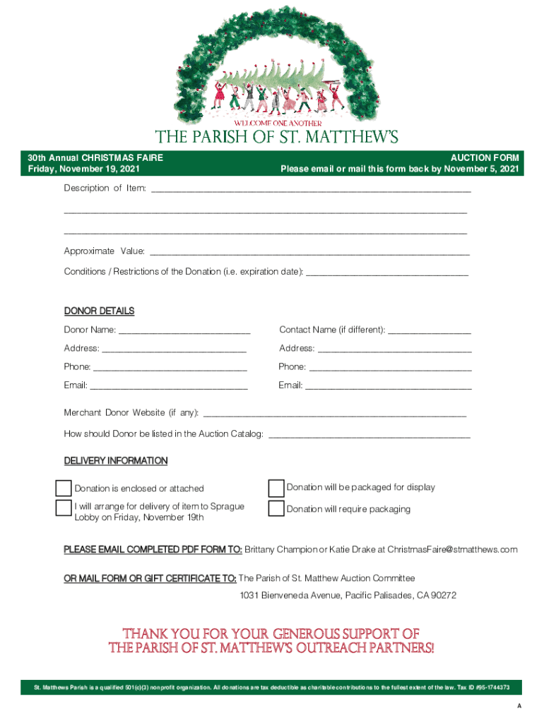 THE PARISH OF ST. MATTHEWS AUCTION FORM Please email or mail this form back by November 5, 202130th Annual CHRISTMAS FAIRE Friday, November 19, 2021Description of Item: ___ ___ ___ Approximate Value: