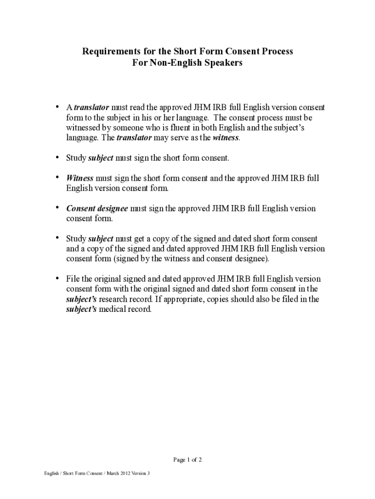 Requirements for the Short Form Consent Process For NonEnglish Speakers A translator must read the approved JHM IRB full English version consent form to the subject in his or her language. The consent
