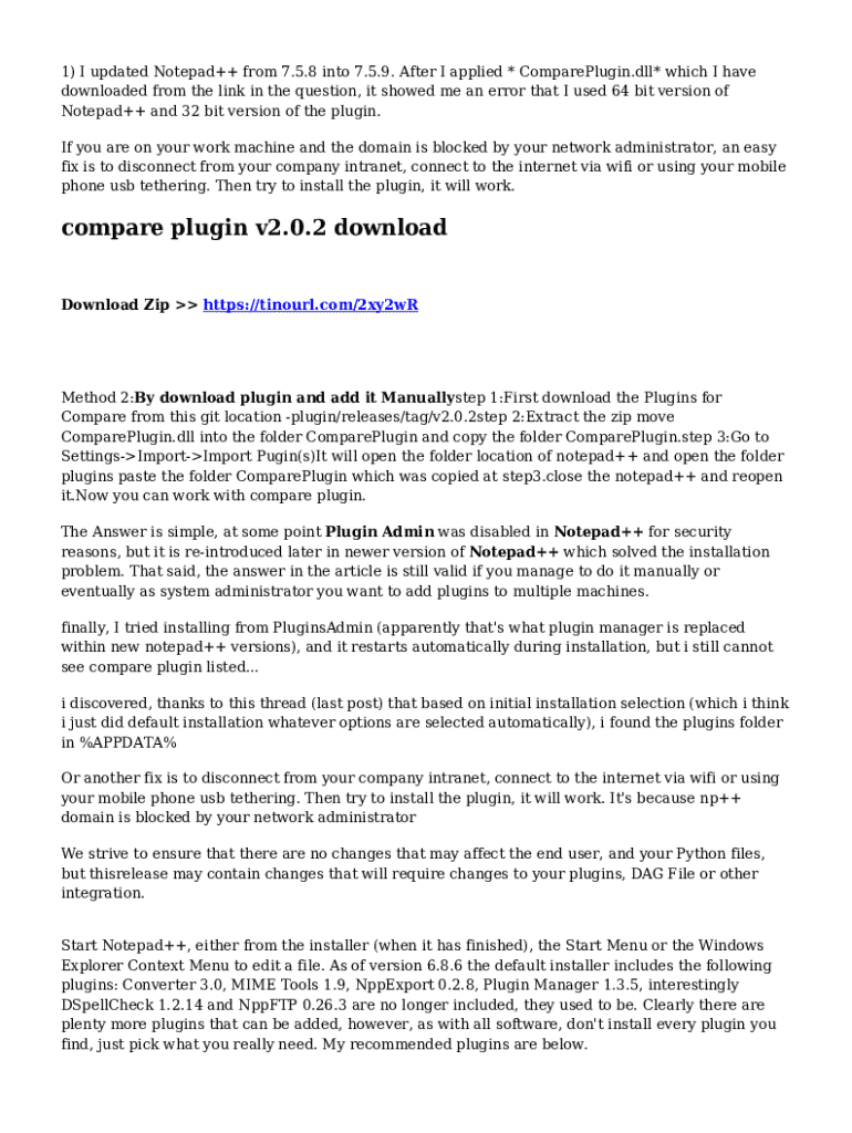 1) I updated Notepad++ from 7.5.8 into 7.5.9. After I applied * ComparePlugin.dll* which I have downloaded from the link in the question, it showed me an error that I used 64 bit version of Notepad++