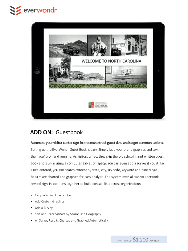 ADD ON: Guestbook Automate your visitor center signin process to track guest data and target communications. Setting up the EverWondr Guest Book is easy. Simply load your brand graphics and text,
