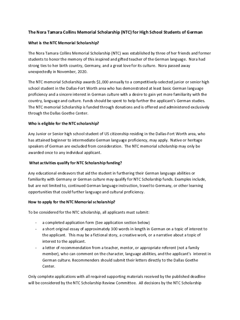 The Nora Tamara Collins Memorial Scholarship (NTC) for High School Students of German What is the NTC Memorial Scholarship? The Nora Tamara Collins Memorial Scholarship (NTC) was established by three