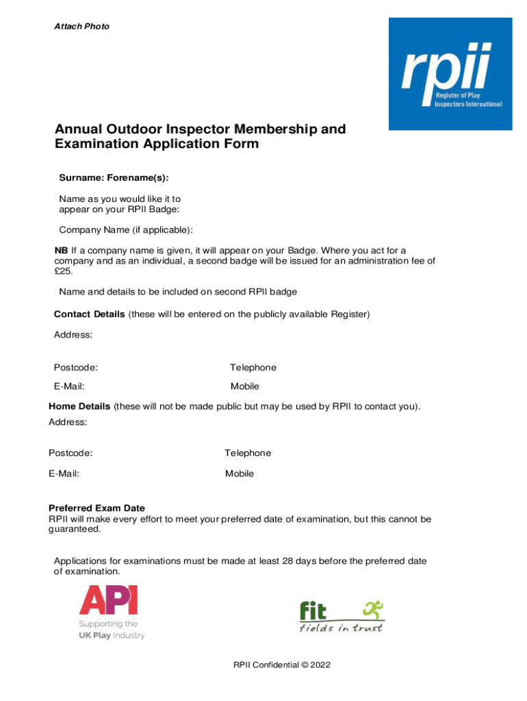 Attach PhotoAnnual Outdoor Inspector Membership and Examination Application Form Surname: Forename(s): Name as you would like it to appear on your RPII Badge: Company Name (if applicable): NB If a