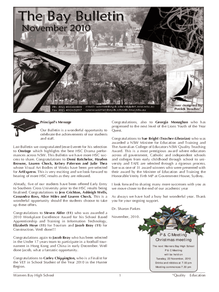 Principals Message Our Bulletin is a wonderful opportunity to celebrate the achievements of our students and staff. Last Bulletin we congratulated Jesse Everett for his selection to Onstage which