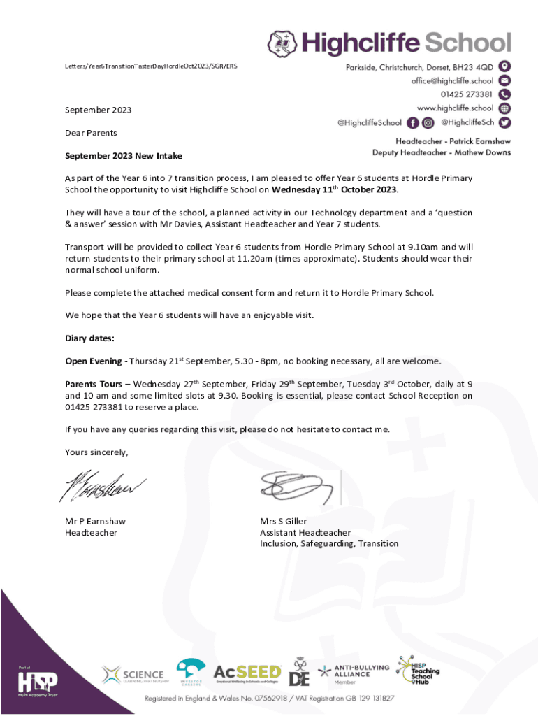 Letters/Year6TransitionTasterDayHordleOct2023/SGR/ERSSeptember 2023 Dear Parents September 2023 New Intake As part of the Year 6 into 7 transition process, I am pleased to offer Year 6 students at