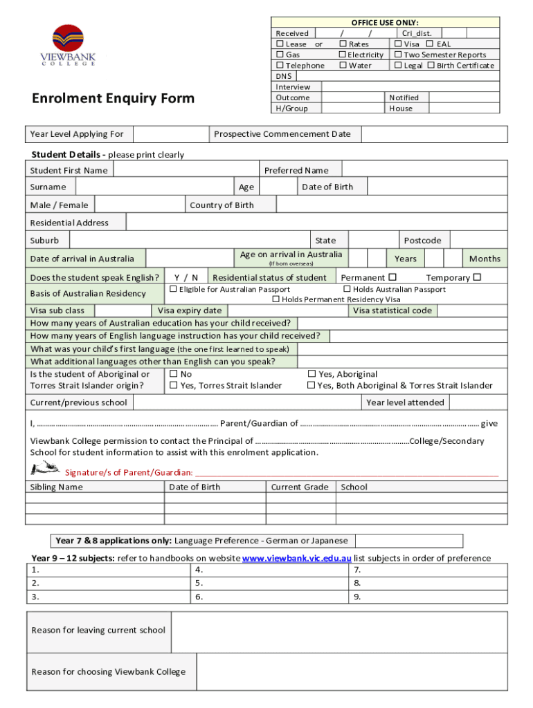 Received Lease or Gas Telephone DNS Interview Outcome H/GroupEnrolment Enquiry Form Year Level Applying ForOFFICE USE ONLY: / / Cri_dist. Rates Visa EAL Electricity Two Semester Reports Water Legal