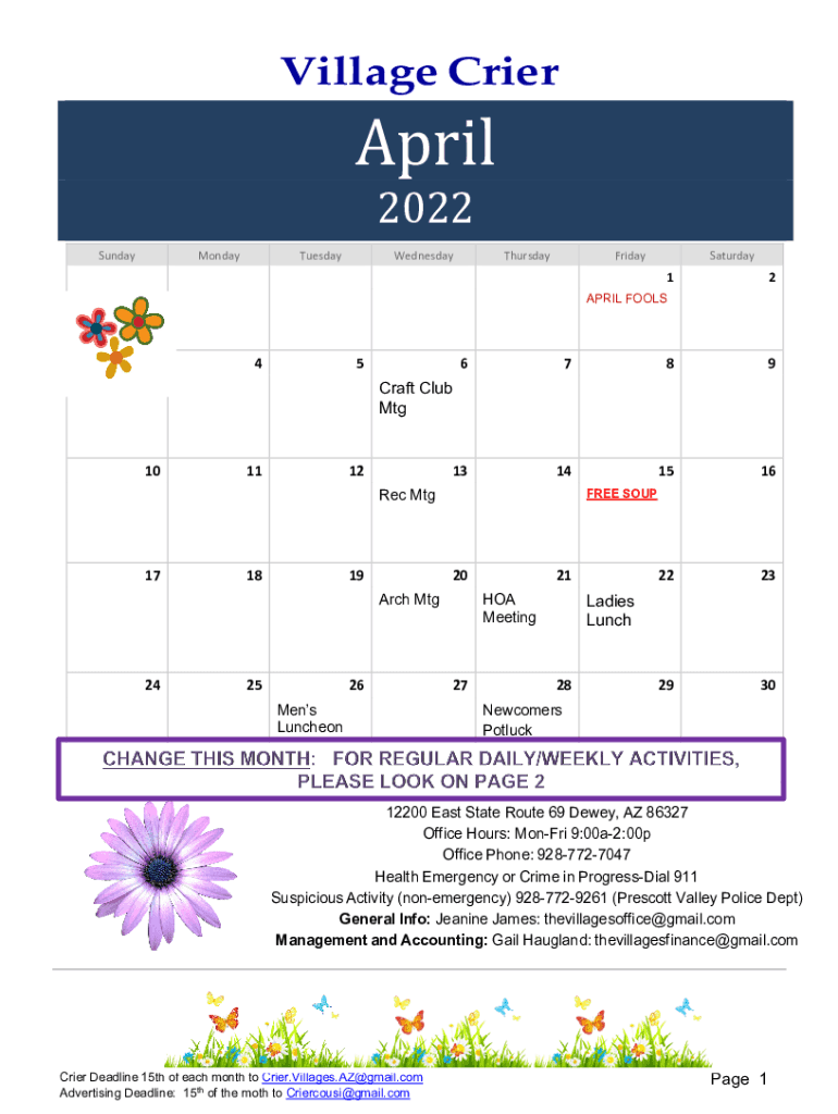 Village CrierSundayMonday3Tuesday4April 2022 Wednesday5ThursdayFridaySaturday12APRIL FOOLS67891314151622232930Craft Club Mtg 101112 Rec Mtg171819FREE SOUP20 Arch Mtg242526 Mens Luncheon21Ladies LunchHOA