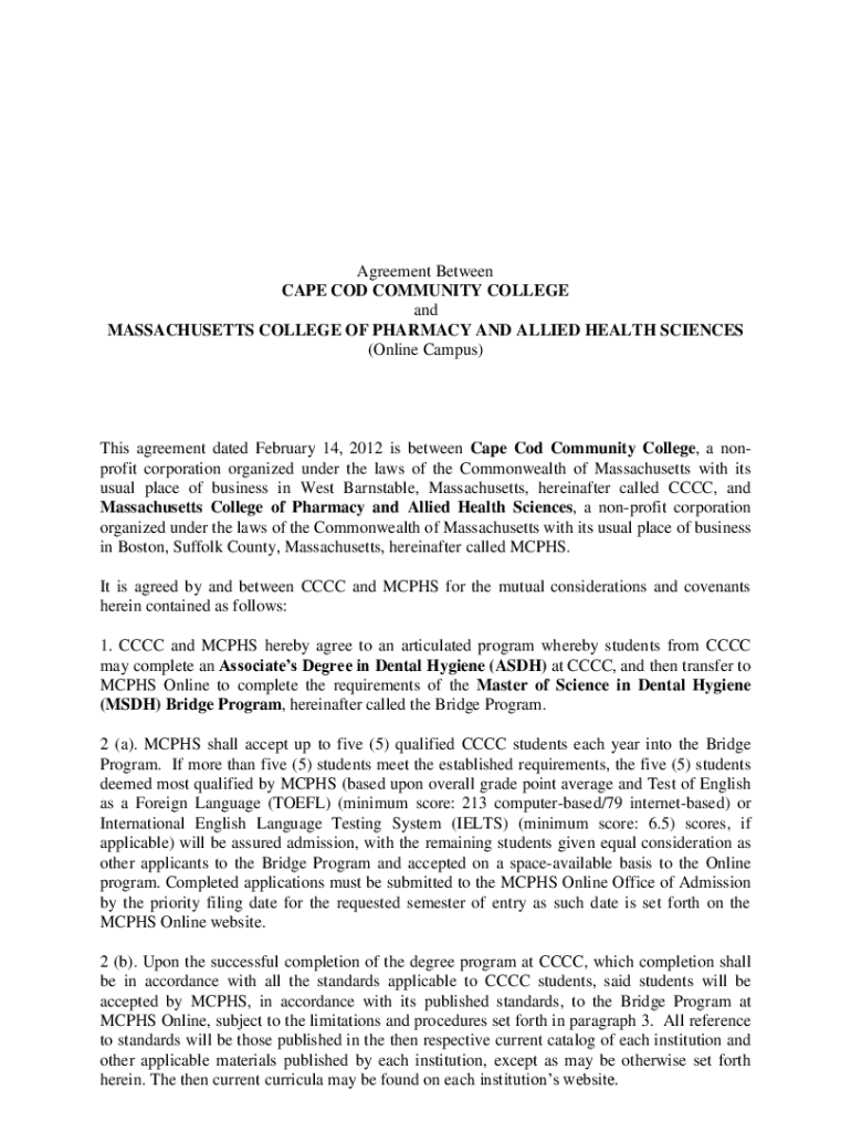 Agreement Between CAPE COD COMMUNITY COLLEGE and MASSACHUSETTS COLLEGE OF PHARMACY AND ALLIED HEALTH SCIENCES (Online Campus)This agreement dated February 14, 2012 is between Cape Cod Community College,