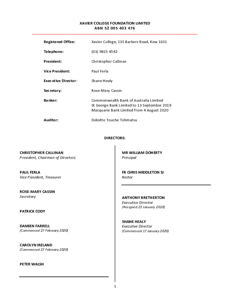 XAVIER COLLEGE FOUNDATION LIMITED ABN 52 005 403 476 ___Registered Office:Xavier College, 135 Barkers Road, Kew 3101Telephone:(03) 9815 4542President:Christopher CallinanVice President:Paul FerlaExecutive