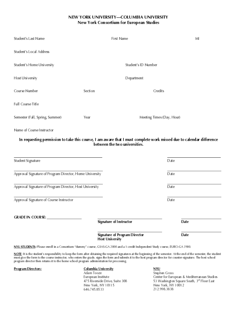 NEW YORK UNIVERSITYCOLUMBIA UNIVERSITY New York Consortium for European StudiesStudents Last NameFirst NameMIStudents Local Address Students Home UniversityStudents ID NumberHost UniversityDepartmentCourse