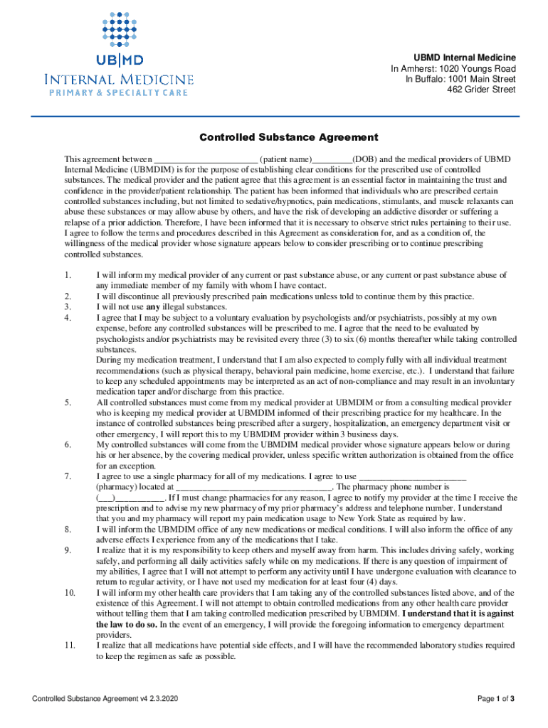 UBMD Internal Medicine In Amherst: 1020 Youngs Road In Buffalo: 1001 Main Street 462 Grider StreetControlled Substance Agreement This agreement between (patient name) (DOB) and the medical providers