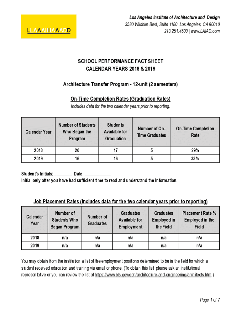 Los Angeles Institute of Architecture and Design 3580 Wilshire Blvd, Suite 1180. Los Angeles, CA 90010 213.251.4500 | www.LAIAD.comSCHOOL PERFORMANCE FACT SHEET CALENDAR YEARS 2018 & 2019 Architecture