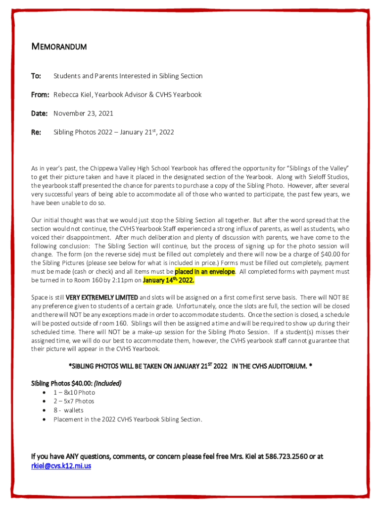 MEMORANDUM To:Students and Parents Interested in Sibling SectionFrom: Rebecca Kiel, Yearbook Advisor & CVHS Yearbook Date: November 23, 2021 Re:Sibling Photos 2022 January 21st, 2022As in years past,