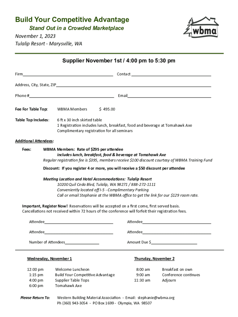 Build Your Competitive Advantage Stand Out in a Crowded Marketplace November 1, 2023 Tulalip Resort Marysville, WA Supplier November 1st / 4:00 pm to 5:30 pm FirmContactAddress, City, State, ZIPPhone