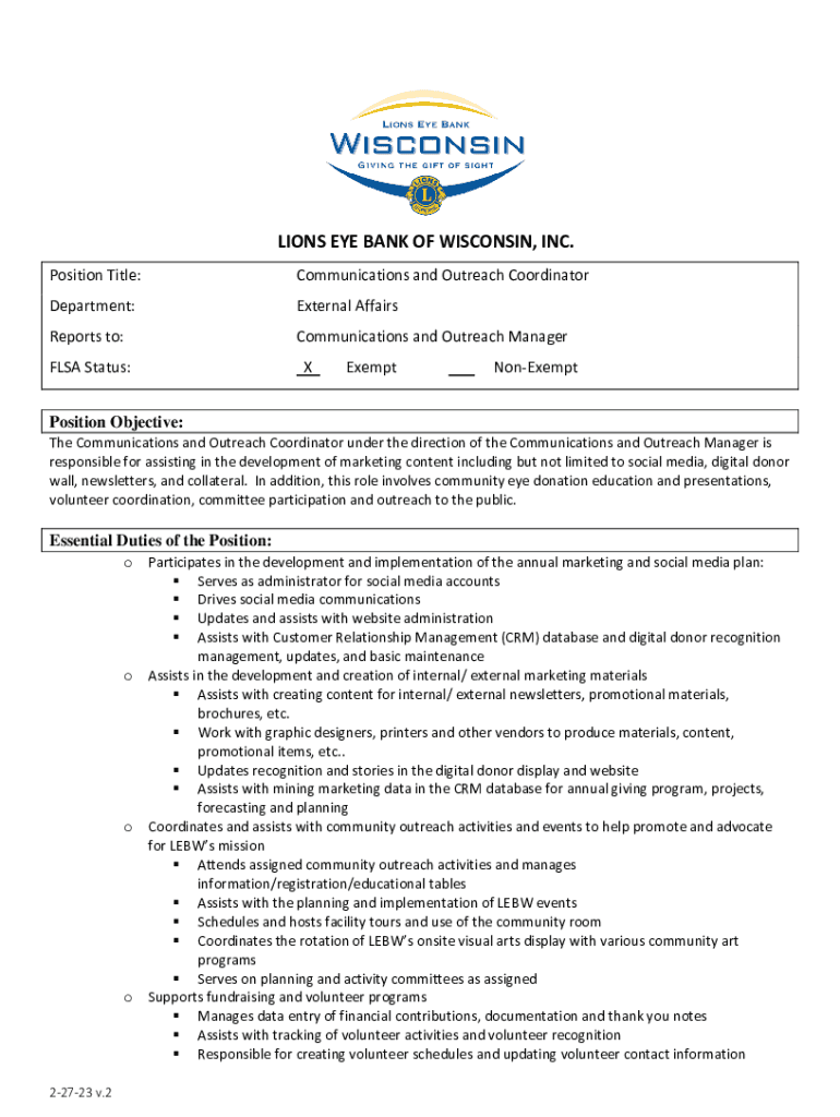 LIONS EYE BANK OF WISCONSIN, INC. Position Title:Communications and Outreach CoordinatorDepartment:External AffairsReports to:Communications and Outreach ManagerFLSA Status:XExemptNonExemptPosition