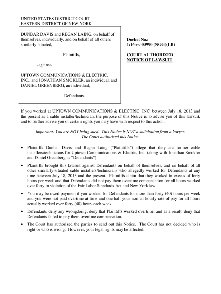DUNBAR DAVIS and REGAN LYING, on behalf of