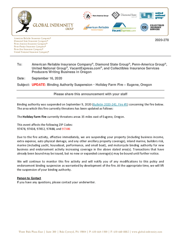 American Reliable Insurance Company Diamond State Insurance Company PennAmerica Insurance Company PennPatriot Insurance Company PennStar Insurance Company United National Insurance Company2020278To:American