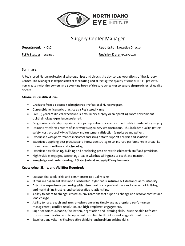 Surgery Center Manager Department: NICLCReports to: Executive DirectorFLSA Status: ExemptRevision Date: 6/18/2018Summary: A Registered Nurse professional who organizes and directs the daytoday operations