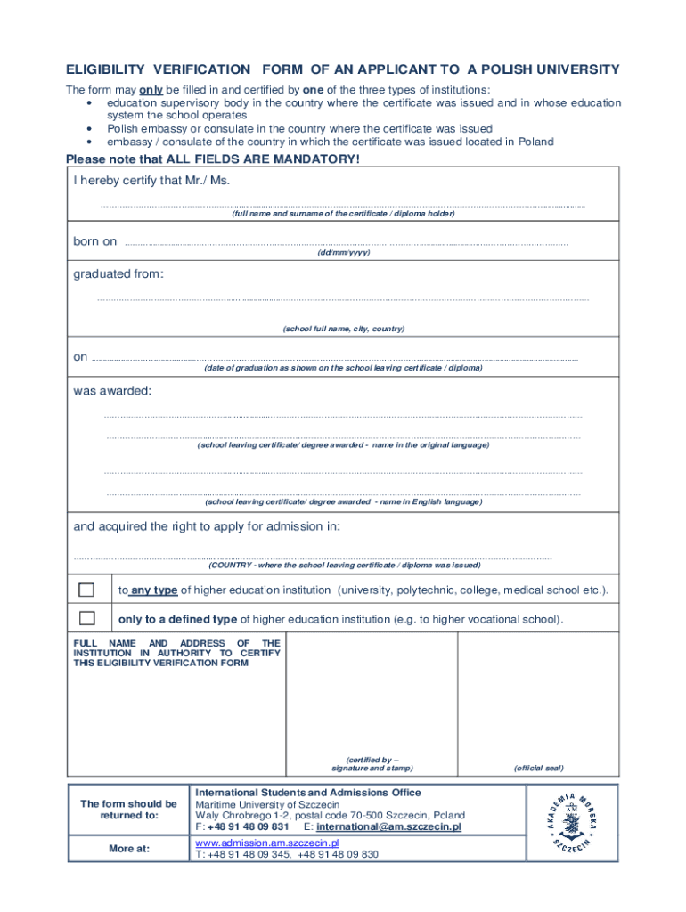 ELIGIBILITY VERIFICATION FORM OF AN APPLICANT TO A POLISH UNIVERSITY