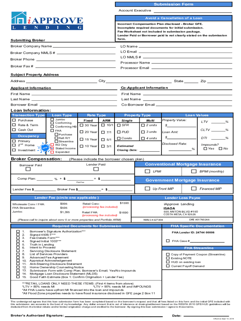 Submission Form Account ExecutiveAvoid a Cancellation of a Loan Incorrect Compensation Plan disclosed Broker GFE. Incomplete required documents for initial submission. Fee Worksheet not included in