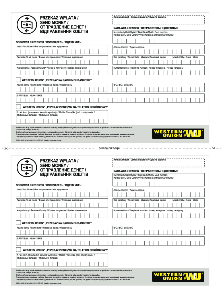 PRZEKAZ WPATA / SEND MONEY / / Kwota / Amount / / NADAWCA / SENDER / / Numer karty Gold/MyWU / Gold Card/MyWU Card number / Gold Card/MyWU / Gold Card/MyWUODBIORCA / RECEIVER / / Imi / First Name