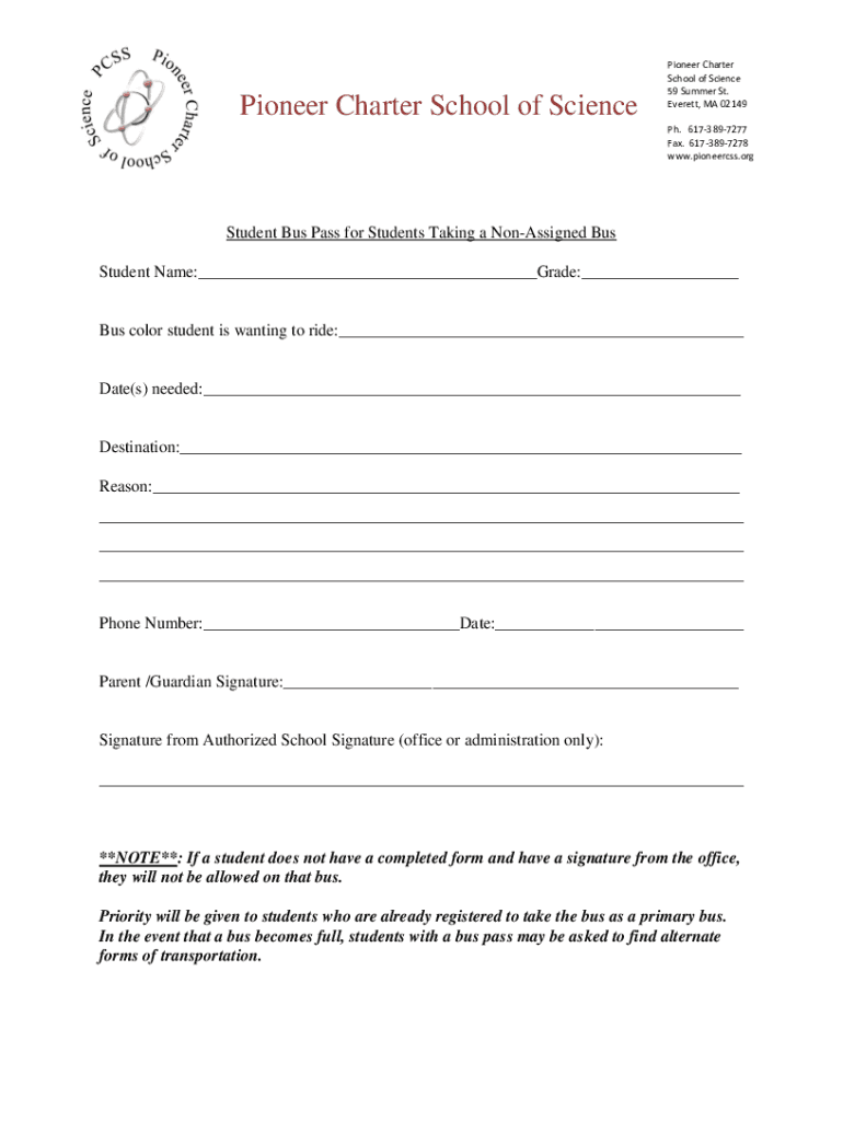Get the free Bus Pass for Students Taking a Non-Assigned Bus