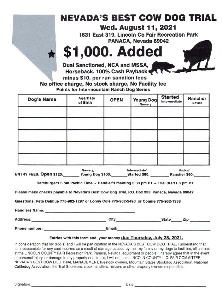 NEVADA\'S BEST COW DOG TRIAL Wed. August 11 5 2021 1631 East 319, Lincoln Co Fair Recreation Park PANACA, Nevada 89042El $1,000. AddedOWDual Sanctioned, NCA and MSSA, Horseback, 100% Cash Payback