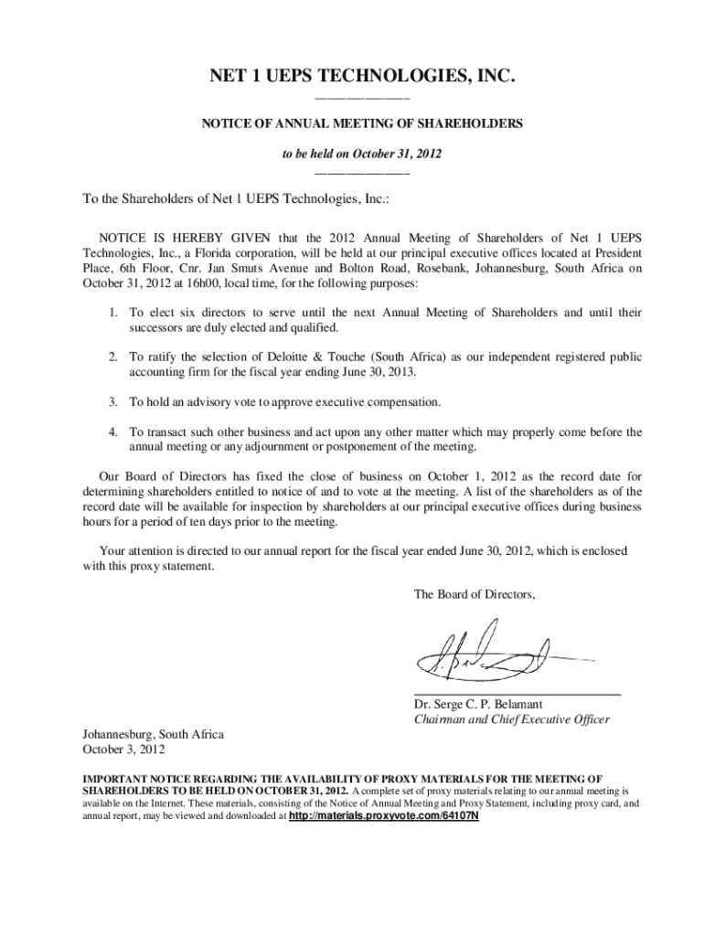 NET 1 UEPS TECHNOLOGIES, INC. ___ NOTICE OF ANNUAL MEETING OF SHAREHOLDERS to be held on October 31, 2012 ___To the Shareholders of Net 1 UEPS Technologies, Inc.: NOTICE IS HEREBY GIVEN that the 2012