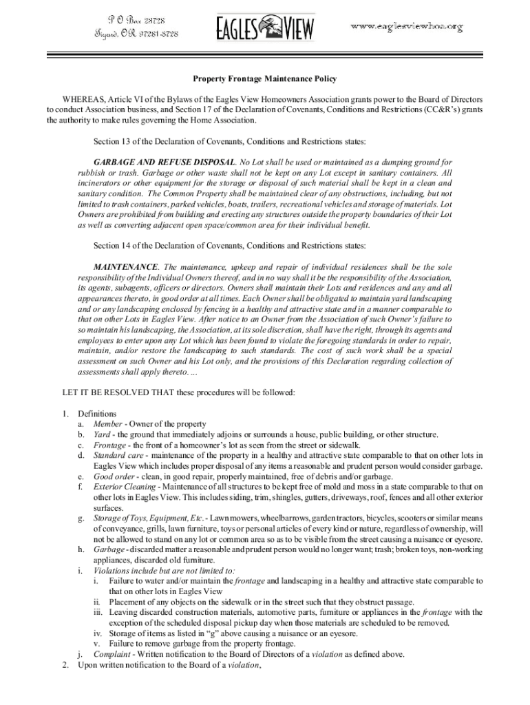 Property Frontage Maintenance Policy WHEREAS, Article VI of the Bylaws of the Eagles View Homeowners Association grants power to the Board of Directors to conduct Association business, and Section