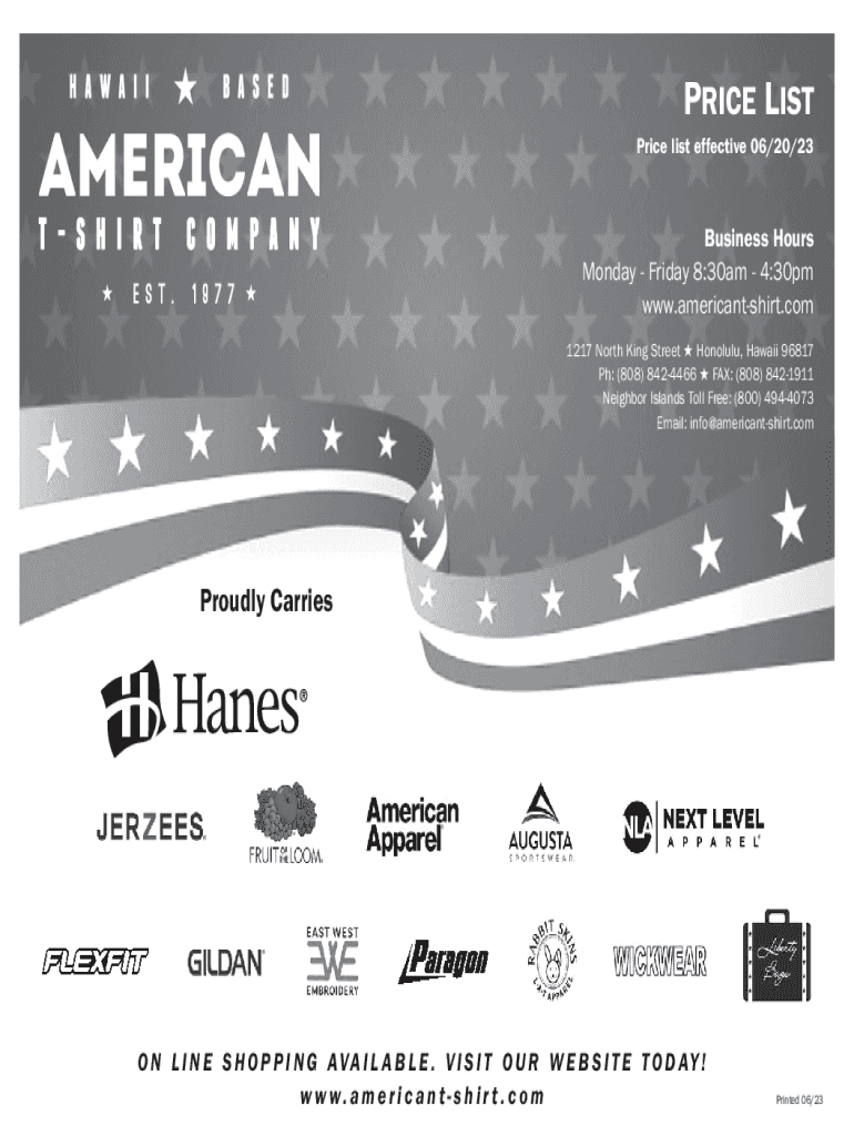 PRICE LIST Price list effective 06/20/23Business Hours Monday Friday 8:30am 4:30pm www.americantshirt.com 1217 North King Street H Honolulu, Hawaii 96817 Ph: (808) 8424466 H FAX: (808) 8421911 Neighbor