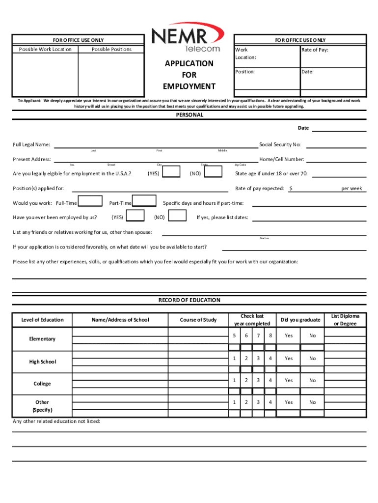 FOR OFFICE USE ONLY Possible Work LocationFOR OFFICE USE ONLYPossible PositionsAPPLICATION FOR EMPLOYMENTWork Location:Rate of Pay:Position:Date:To Applicant: We deeply appreciate your interest in