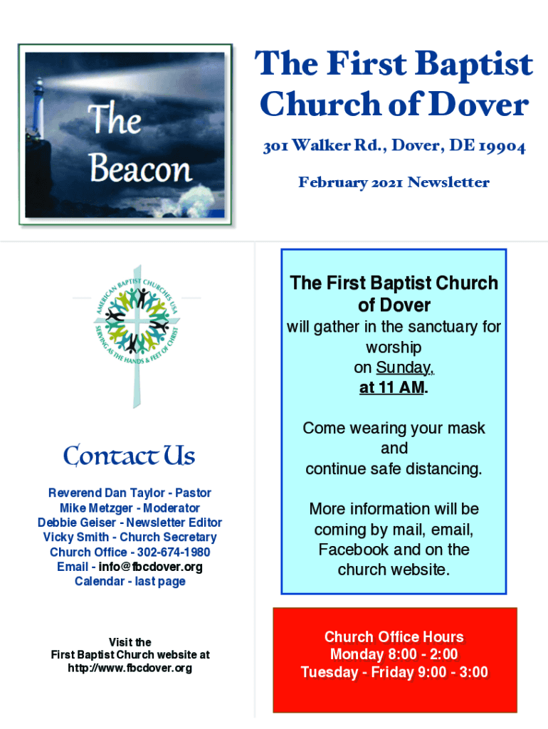 The First Baptist Church of Dover 301 Walker Rd., Dover, DE 19904 February 2021 NewsletterThe First Baptist Church of Dover will gather in the sanctuary for worship on Sunday, at 11 AM.Contact UsCome