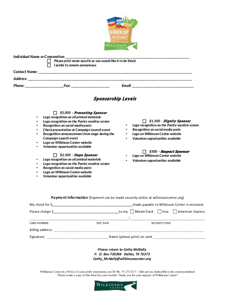 Individual Name or Corporation: ___ ! !Please print name exactly as you would like it to be listed. I prefer to remain anonymousContact Name: ___ Address: ___ Phone: ___Fax: ___Email: ___Sponsorship